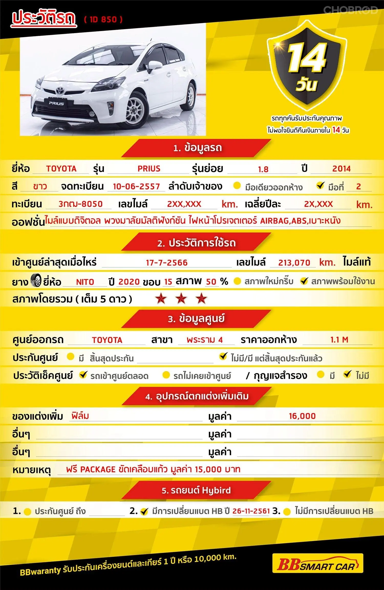 TOYOTA PRIUS 1.8 AT 2014 ออกรถ 0 บาท จัดได้ 279,000 บ. Line:@**********แสดงข้อมูล 🔥จอง 199 บาท ส่งบัตรประชาชน รู้ผลพิจารณาภายใน 30 นาที ไม่ผ่านคืนเงินจองทุกกรณี 🔥ซื้อรถกับ BB พร้อมให้คำปรึกษา แก้ทุกปัญหา ให้ทุกเรื่อง บริการ call center 24 ชม. 🔥BB Care Plus รับประกันหลังการขาย สูงสุด 2 ปี หรือ 20,000 km.. 🔥มีรถให้เลือกมากกว่า 1,600 คัน สาขา 1 สี่แยกมไหสวรรย์ ใกล้เดอะมอลล์ท่าพระ รหัสรถ 1D850 ราคา 259,000 บาท ผ่อนเพียง 5,106 บาท Brand. : TOYOTA Year. : 2014 Model. : PRIUS Grade. : 1.8 Engine. : 1800 CC Type. : เบนซิน-ไฟฟ้า Gearbox : AT Color. : ขาว Mileage. : 244,XXX KM. (ซื้อสด ราคานี้ยังไม่รวมค่าดำเนินการ 10,000 บ.) 🚩 Price. 259,000 บาท ยอดจัด : 269,000 บาท เงินดาวน์ : 0 บาท ประกันภัย : ฟรีประกันภัย 1 ปี ค่าดำเนินการ : 10,000 บาท รวมออกรถ : 0 บาท ผ่อน 36 งวด = 8,955 บาท ผ่อน 48 งวด = 6,956 บาท ผ่อน 60 งวด = 6,116 บาท ผ่อน 72 งวด = 5,437 บาท ผ่อน 84 งวด = 5,106 บาท เงื่อนไขเป็นไปตามที่ไฟแนนซ์กำหนด โปรโมชั่นพิเศษ สำหรับลูกค้าเครดิตดีลือกรับเรทดอกเบี้ยพิเศษ 📍36 งวด = 1.29 % 📍48 งวด = 1.99 % 📍60 งวด = 2.39 % 📍72 งวด = 3.59 % 🔥 เงื่อนไข โปรโมชั่น ดอกเบี้ยเริ่มต้น 1.29% ตลอดอายุสัญญา - ยอดจัดไฟแนนซ์ 300,000-600,000 บาท - ผ่อนสูงสุด 72 เดือน - เป็นลูกค้าประวัติดี พนักงานประจำเงินเดือน 20,000 ขึ้นไป - ค่าดำเนินการแคมเปญ 20,000 บาท (รวมในยอดจัดได้) 🎗Car Hightlight รถสวยๆ วันนี้ขอแนะนำ TOYOTA PRIUS 1.8 AT เบนซิน-ไฟฟ้า 2014 จุดเด่นออฟชั่น 1 : ไมล์แบบดิจิตอล 2 : พวงมาลัยมัลติฟังก์ชัน 3 : ไฟหน้าโปรเจตเตอร์ 🎗ภายใน AIRBAG,ABS,เบาะหนัง,กระจกไฟฟ้า,วิทยุ AUX 🎗ภายนอก ตัวรถสีขาวมาพร้อมไฟหน้าโปรเจตเตอร์ รถสวยสภาพพร้อมใช้งานเลยค่ะ 🎗ความคุ้มค่า สำหรับคันนี้หากเปรียบเทียบราคากับคุณภาพ คันนี้ถือว่าคุ้มค่ามากค่ะ ผ่อนสบายๆก็มีรถขับได้ รถดีมีคุณภาพแบบนี้รีบตัดสินใจซื้อได้เลราคานี้มาไวไปไวนะคะ ⭐️การรับประกันหลังการขาย BB Care Plus สูงสุด 2 ปี หรือ 20,000 km. ด้วยช่างที่ผ่านการอบรมจากศูนย์ชั้นนำของประเทศ 🎉Special offer เฉพาะ บีบีสมาร์ทคาร์ ที่นี่ที่เดียว ⭐ดอกเบี้ยเริ่มต้น 1.29% มีไฟแนนซ์รองรับหลายที่ค่ะ ⭐ฟรี!! แพคเก็จ ขัดเคลือบแก้ว มูลค่า 15,000 บาท ทุกคัน ⭐อนุมัติไว 30 นาที นำเอกสารมาให้ครบรับรถกลับบ้านทันทีค่ะ ⭐BB Care Plus รับประกันหลังการขาย สูงสุด 2 ปี หรือ 20,000 km. ⭐มี 6 สาขา ในกรุงเทพและปริมณฑลใกล้บ้านท่าน ⭐รถทุกคันผ่านตรวจสอบ Inspection เรียบร้อยแล้วค่ะ ผ่าน 5 ดาวทุกคันค่ะ ⭐เซลล์ทุกท่านเป็นมืออาชีพพร้อมให้บริการทุกท่านแน่นอนค่ะ