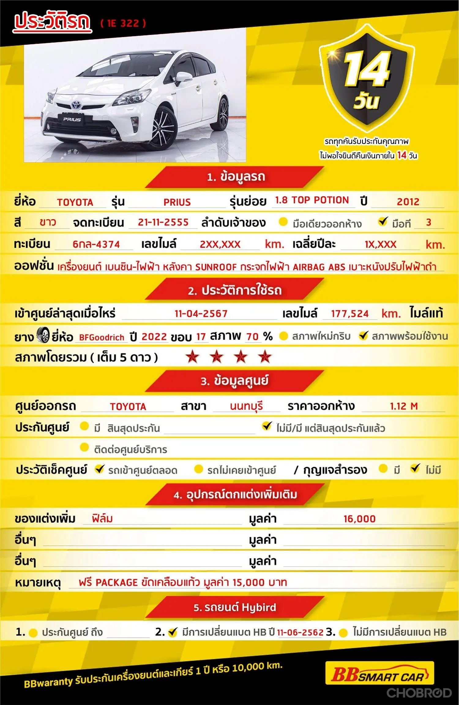 มีการรับประกันจากดีลเลอร์ (6 เดือน) มีบริการช่วยเหลือฉุกเฉินบนท้องถนน 24 ชม. จากดีลเลอร์