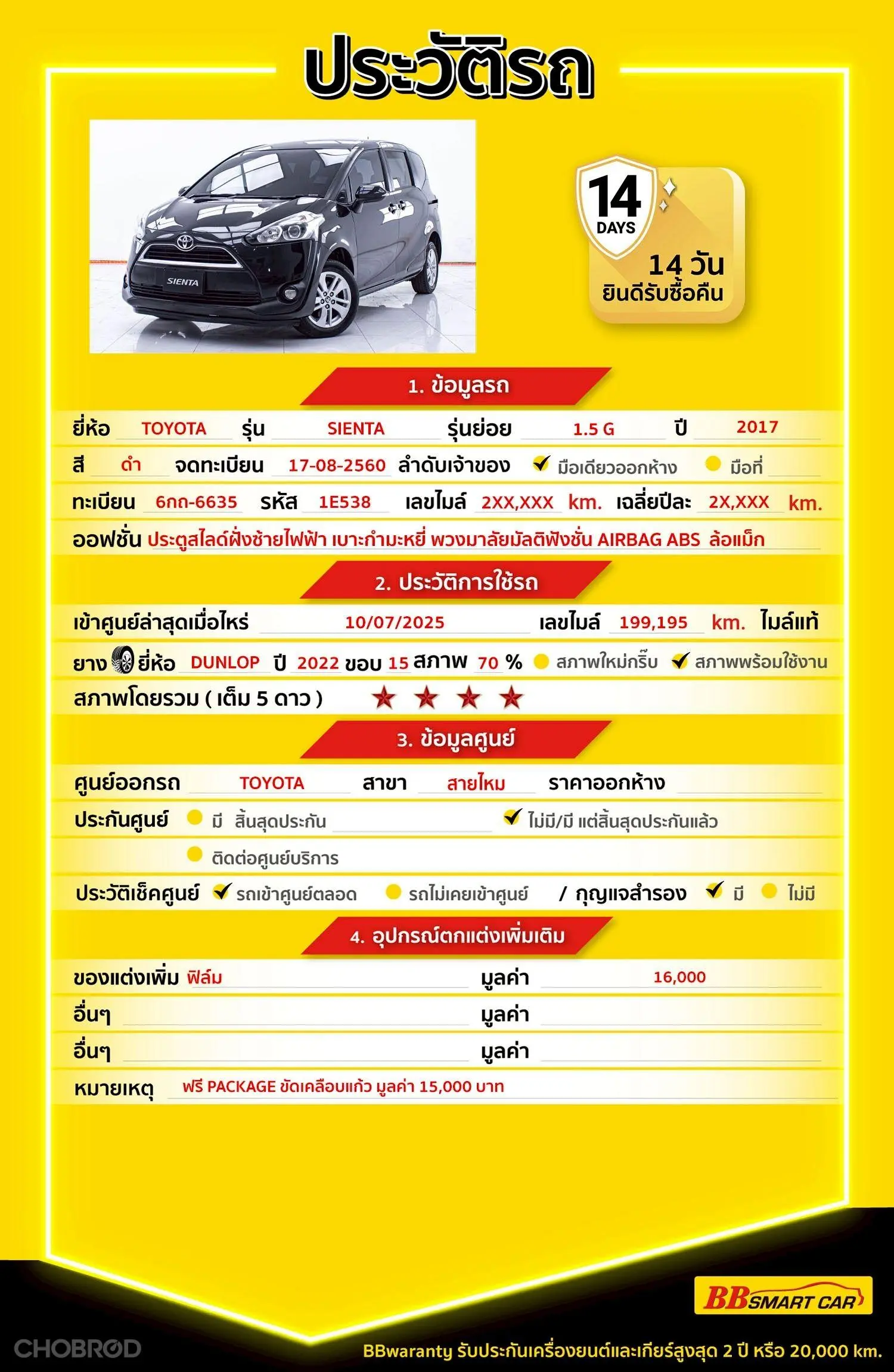 TOYOTA SIENTA 1.5 G AT 2017 ออกรถ 0 บาท จัดได้ 364,000 บ. Line : ***********แสดงข้อมูล 🔥จอง 199 บาท ส่งบัตรประชาชน รู้ผลพิจารณาภายใน 30 นาที ไม่ผ่านคืนเงินจองทุกกรณี 🔥ซื้อรถกับ BB พร้อมให้คำปรึกษา แก้ทุกปัญหา ให้ทุกเรื่อง บริการ call center 24 ชม. 🔥BB Care Plus รับประกันหลังการขาย สูงสุด 2 ปี หรือ 20,000 km.. 🔥มีรถให้เลือกมากกว่า 1,800 คัน สาขา 1 สี่แยกมไหสวรรย์ ใกล้เดอะมอลล์ท่าพระ รหัสรถ 1E538 ราคา 344,000 บาท ผ่อนเพียง 6,362 บาท Brand. : TOYOTA Year. : 2017 Model. : SIENTA Grade. : 1.5 G Engine. : 1500 CC Type. : เบนซิน Gearbox : AT Color. : ดำ Mileage. : 202,XXX KM. (ซื้อสด ราคานี้ยังไม่รวมค่าดำเนินการ 10,000 บ.) 🚩 Price. 344,000 บาท ยอดจัด : 354,000 บาท เงินดาวน์ : 0 บาท ประกันภัย : ฟรีประกันภัย 1 ปี ค่าดำเนินการ : 10,000 บาท รวมออกรถ : 0 บาท ผ่อน 36 งวด = 11,750 บาท ผ่อน 48 งวด = 9,120 บาท ผ่อน 60 งวด = 7,604 บาท ผ่อน 72 งวด = 6,836 บาท ผ่อน 84 งวด = 6,362 บาท เงื่อนไขเป็นไปตามที่ไฟแนนซ์กำหนด โปรโมชั่นพิเศษ สำหรับลูกค้าเครดิตดีลือกรับเรทดอกเบี้ยพิเศษ 📍36 งวด = 1.29 % 📍48 งวด = 1.99 % 📍60 งวด = 2.39 % 📍72 งวด = 3.59 % 🔥 เงื่อนไข โปรโมชั่น ดอกเบี้ยเริ่มต้น 1.29% ตลอดอายุสัญญา - ยอดจัดไฟแนนซ์ 300,000-600,000 บาท - ผ่อนสูงสุด 72 เดือน - เป็นลูกค้าประวัติดี พนักงานประจำเงินเดือน 20,000 ขึ้นไป - ค่าดำเนินการแคมเปญ 20,000 บาท (รวมในยอดจัดได้) 🎗Car Hightlight รถสวยๆ วันนี้ขอแนะนำ TOYOTA SIENTA 1.5 G AT 2017 จุดเด่นออฟชั่น 1 : ประตูสไลด์ฝั่งซ้ายไฟฟ้า 2 : เบาะกำมะหยี่ 3 : พวงมาลัยมัลติ ล้อแม็ก 🎗ภายใน AIRBAG ABS 🎗ภายนอก กระจกมองข้างสีเดียวกับตัวรถ กระจกมองข้าง ปรับและพับด้วยไฟฟ้า พร้อมไฟเลี้ยวในตัว มือเปิดประตูภายนอก สีเดียวกับตัวรถ ไฟหน้า LED (มัลติรีเฟลกเตอร์) ไฟ Daytime Running Lights (LED) ที่ปัดหมอกด้านหลัง เสาอากาศแบบสั้น 🎗ความคุ้มค่า สำหรับคันนี้หากเปรียบเทียบราคากับคุณภาพ คันนี้ถือว่าคุ้มค่ามากค่ะ ผ่อนสบายๆก็มีรถขับได้ รถดีมีคุณภาพแบบนี้รีบตัดสินใจซื้อได้เลราคานี้มาไวไปไวนะคะ ⭐️การรับประกันหลังการขาย BB Care Plus สูงสุด 2 ปี หรือ 20,000 km. ด้วยช่างที่ผ่านการอบรมจากศูนย์ชั้นนำของประเทศ 🎉Special offer เฉพาะ บีบีสมาร์ทคาร์ ที่นี่ที่เดียว ⭐ดอกเบี้ยเริ่มต้น 1.29% มีไฟแนนซ์รองรับหลายที่ค่ะ ⭐ฟรี!! แพคเก็จ ขัดเคลือบแก้ว มูลค่า 15,000 บาท ทุกคัน ⭐อนุมัติไว 30 นาที นำเอกสารมาให้ครบรับรถกลับบ้านทันทีค่ะ ⭐BB Care Plus รับประกันหลังการขาย สูงสุด 2 ปี หรือ 20,000 km. ⭐มี 6 สาขา ในกรุงเทพและปริมณฑลใกล้บ้านท่าน ⭐รถทุกคันผ่านตรวจสอบ Inspection เรียบร้อยแล้วค่ะ ผ่าน 5 ดาวทุกคันค่ะ ⭐เซลล์ทุกท่านเป็นมืออาชีพพร้อมให้บริการทุกท่านแน่นอนค่ะ เลือกข้อเสนอที่ให้คุณมากกว่าที่อื่น เพราะเราเล็งเห็นแล้ว ที่บีบีสมาร์ทคาร์ ให้คุณได้มากกว่าที่อื่นแน่นอนครับ มาที่เดียวจบทุกปัญหา หลากหลายรุ่นให้เลือกกับบริการที่คุณต้องประทับใจแน่นอ