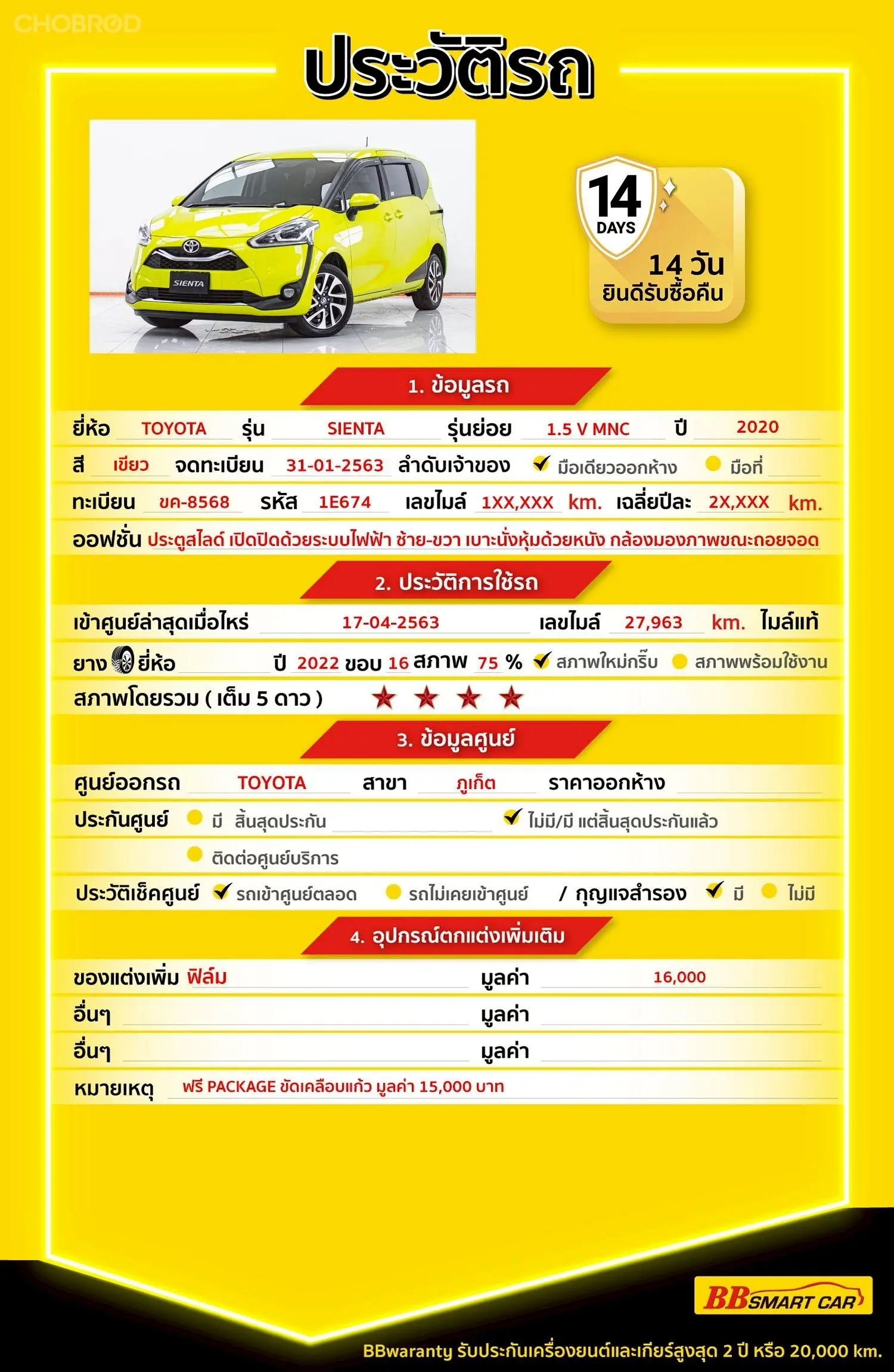 TOYOTA SIENTA 1.5 V MNC AT 2020 ออกรถ 0 บาท จัดได้ 469,000 บ. Line : @bbsmartcar 🔥จอง 199 บาท ส่งบัตรประชาชน รู้ผลพิจารณาภายใน 30 นาที ไม่ผ่านคืนเงินจองทุกกรณี 🔥ซื้อรถกับ BB พร้อมให้คำปรึกษา แก้ทุกปัญหา ให้ทุกเรื่อง บริการ call center 24 ชม. 🔥BB Care Plus รับประกันหลังการขาย สูงสุด 2 ปี หรือ 20,000 km.. 🔥มีรถให้เลือกมากกว่า 1,800 คัน สาขา 1 สี่แยกมไหสวรรย์ ใกล้เดอะมอลล์ท่าพระ รหัสรถ 1E674 ราคา 449,000 บาท ผ่อนเพียง 7,685 บาท Brand. : TOYOTA Year. : 2020 Model. : SIENTA Grade. : 1.5 V MNC Engine. : 1500 CC Type. : เบนซิน Gearbox : AT Color. : เขียว Mileage. : 147,XXX KM. (ซื้อสด ราคานี้ยังไม่รวมค่าดำเนินการ 10,000 บ.) 🚩 Price. 449,000 บาท ยอดจัด : 459,000 บาท เงินดาวน์ : 0 บาท ประกันภัย : ฟรีประกันภัย 1 ปี ค่าดำเนินการ : 10,000 บาท รวมออกรถ : 0 บาท ผ่อน 36 งวด = 14,170 บาท ผ่อน 48 งวด = 10,760 บาท ผ่อน 60 งวด = 9,450 บาท ผ่อน 72 งวด = 8,454 บาท ผ่อน 84 งวด = 7,685 บาท เงื่อนไขเป็นไปตามที่ไฟแนนซ์กำหนด โปรโมชั่นพิเศษ สำหรับลูกค้าเครดิตดีลือกรับเรทดอกเบี้ยพิเศษ 📍36 งวด = 1.29 % 📍48 งวด = 1.99 % 📍60 งวด = 2.39 % 📍72 งวด = 3.59 % 🔥 เงื่อนไข โปรโมชั่น ดอกเบี้ยเริ่มต้น 1.29% ตลอดอายุสัญญา - ยอดจัดไฟแนนซ์ 300,000-600,000 บาท - ผ่อนสูงสุด 72 เดือน - เป็นลูกค้าประวัติดี พนักงานประจำเงินเดือน 20,000 ขึ้นไป - ค่าดำเนินการแคมเปญ 20,000 บาท (รวมในยอดจัดได้) 🎗Car Hightlight รถสวยๆ วันนี้ขอแนะนำ TOYOTA SIENTA 1.5 V MNC AT เบนซิน 2020 จุดเด่นออฟชั่น 1 : ไฟหน้า Projector Lens แบบ Bi-Beam LED 2 : เบาะนั่งหุ้มด้วยหนัง สีดำสลับสีส้ม 3 : ประตูสไลด์ เปิดปิดด้วยระบบไฟฟ้า ซ้าย-ขวา 🎗ภายใน - ระบบปัดน้ำฝนกระจกบังลมหน้า ตั้งหน่วงเวลาได้ - พวงมาลัย / หัวเกียร์ หุ้มด้วยหนัง - ระบบกุญแจ Smart Keyless Entry - ปุ่มสตาร์ทเครื่องยนต์ Push Start Button - มาตรวัดเรืองแสง Optitron - หน้าจอแสดงข้อมูลการขับขี่ MID แบบสี TFT ขนาด 4.2 นิ้ว - สวิตซ์ควบคุมเครื่องเสียง / จอ MID บนพวงมาลัย - เครื่องเสียง หน้าจอระบบสัมผัส Touchscreen ขนาด 7 นิ้ว -จอ LED ขนาด 8 นิ้ว สำหรับผู้โดยสารตอนหลัง - ระบบปรับอากาศ แบบอัตโนมัติ พร้อมจอแสดงผลดิจิตอล - กล้องมองภาพขณะถอยจอด พร้อมเส้นกะระยะ - ช่องเก็บเอกสาร หลังเบาะผู้โดยสารตอนหน้า - ถาดเก็บของ ใต้เบาะผู้โดยสารตอนหน้า 🎗ภายนอก - ระบบปรับสูง-ต่ำ ไฟหน้าอัตโนมัติ - ไฟ Daytime Running Lights แบบ LED - ไฟหรี่ ไฟท้าย แบบ LED Light Guide 🎗ความคุ้มค่า สำหรับคันนี้หากเปรียบเทียบราคากับคุณภาพ คันนี้ถือว่าคุ้มค่ามากค่ะ ผ่อนสบายๆก็มีรถขับได้ รถดีมีคุณภาพแบบนี้รีบตัดสินใจซื้อได้เลราคานี้มาไวไปไวนะคะ ⭐️การรับประกันหลังการขาย BB Care Plus สูงสุด 2 ปี หรือ 20,000 km. ด้วยช่างที่ผ่านการอบรมจากศูนย์ชั้นนำของประเทศ 🎉Special offer เฉพาะ บีบีสมาร์ทคาร์ ที่นี่ที่เดียว ⭐ดอกเบี้ยเริ่มต้น 1.29% มีไฟแนนซ์รองรับหลายที่ค่ะ ⭐ฟรี!! แพคเก็จ ขัดเคลือบแก้ว มูลค่า 15,000 บาท ทุกคัน ⭐อนุมัติไว 30 นาที นำเอกสารมาให้ครบรับรถกลับบ้านทัน