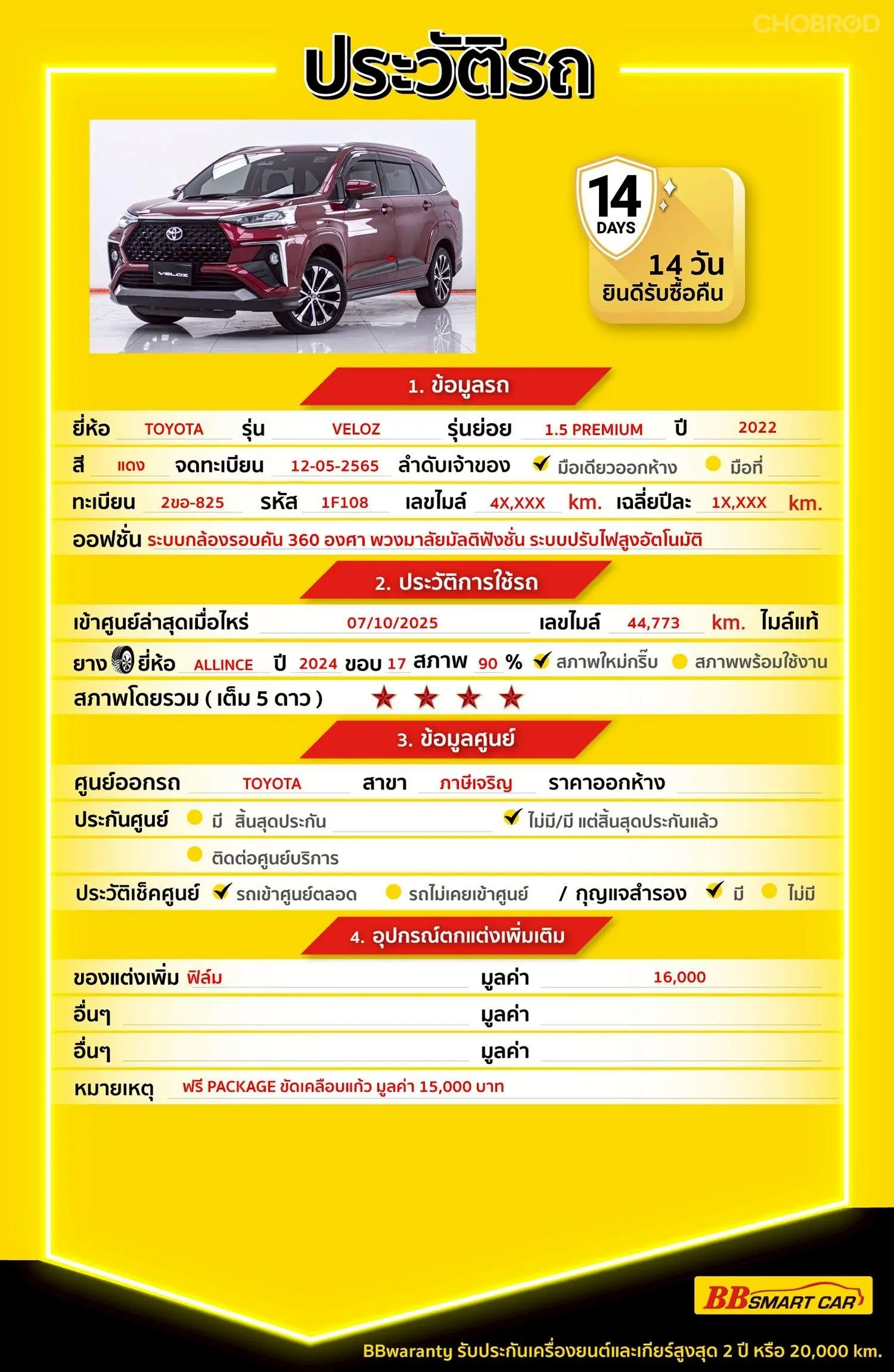 TOYOTA VELOZ 1.5 PREMIUM AT 2022 ออกรถ 0 บาท จัดได้ 619,000 บ. Line:*******แสดงข้อมูล 🔥มีรถให้เลือกมากกว่า 1,800 คัน 🔥รถทุกคันผ่านตรวจสอบ Inspection เรียบร้อยแล้วค่ะ ผ่าน 5 ดาวทุกคันค่ะ 🔥ซื้อรถกับ BB พร้อมให้คำปรึกษา แก้ทุกปัญหา ให้ทุกเรื่อง บริการ call center 24 ชม. 🔥BB Care Plus รับประกันหลังการขาย สูงสุด 2 ปี หรือ 20,000 km. 🔥ฟรี!! แพคเก็จ ขัดเคลือบแก้ว มูลค่า 15,000 บาท ทุกคัน 🔥มี 6 สาขา ในกรุงเทพและปริมณฑลใกล้บ้านท่าน สาขา 1 สี่แยกมไหสวรรย์ ใกล้เดอะมอลล์ท่าพระ รหัสรถ 1F108 ราคา 599,000 บาท ผ่อนเพียง 11,200 บาท Brand. : TOYOTA Year. : 2022 Model. : VELOZ Grade. : 1.5 PREMIUM Engine. : 1500 CC Type. : เบนซิน Gearbox : AT Color. : แดง Mileage. : 48,XXX KM. (ซื้อสด ราคานี้ยังไม่รวมค่าดำเนินการ 10,000 บ.) 🚩 Price. 599,000 บาท ยอดจัด : 609,000 บาท เงินดาวน์ : 0 บาท ประกันภัย : ค่าดำเนินการ : 10,000 บาท รวมออกรถ : 0 บาท ผ่อน 36 งวด = 21,549 บาท ผ่อน 48 งวด = 16,578 บาท ผ่อน 60 งวด = 13,774 บาท ผ่อน 72 งวด = 12,322 บาท ผ่อน 84 งวด = 11,200 บาท เงื่อนไขเป็นไปตามที่ไฟแนนซ์กำหนด โปรโมชั่นพิเศษ สำหรับลูกค้าเครดิตดีลือกรับเรทดอกเบี้ยพิเศษ 📍36 งวด = 1.29 % 📍48 งวด = 1.99 % 📍60 งวด = 2.39 % 📍72 งวด = 3.59 % 🔥 เงื่อนไข โปรโมชั่น ดอกเบี้ยเริ่มต้น 1.29% ตลอดอายุสัญญา - ยอดจัดไฟแนนซ์ 300,000-600,000 บาท - ผ่อนสูงสุด 72 เดือน - เป็นลูกค้าประวัติดี พนักงานประจำเงินเดือน 20,000 ขึ้นไป - ค่าดำเนินการแคมเปญ 20,000 บาท (รวมในยอดจัดได้) 🎗Car Hightlight รถสวยๆ วันนี้ขอแนะนำ TOYOTA VELOZ 1.5 PREMIUM AT 2022 จุดเด่นออฟชั่น 1 : ล้ออัลลอยปัดเงา สีทูโทน ขนาด 17 นิ้ว 2 : หน้าจอ Touchscreen ขนาด 9 นิ้ว 3 : พวงมาลัยมัลติฟังชั่น 🎗ภายใน AIRBAG ABS * ระบบเตือนการชนด้านหน้า Pre-Collision System * ระบบปรับไฟสูงอัตโนมัติ Automatic High Beam * ระบบเตือนเมื่อรถออกนอกเลน และ ดึงพวงมาลัยกลับ Lane Departure Alert * ระบบป้องกันการเหยียบคันเร่งผิดวิธี Pedal Misoperation Control * ระบบเตือนเมื่อรถคันหน้าเคลื่อนตัว Front Departure Alert * สวิตซ์ควบคุมระบบกล้องรอบคัน บนพวงมาลัย * ระบบกล้องรอบคัน 360 องศา Panoramic View Monitor 🎗ภายนอก * ไฟส่องสว่างบริเวณพื้น Foot Lamp * กระจกมองข้างสีเดียวกับตัวรถ * กระจกมองข้างพร้อมไฟเลี้ยว (พับไฟฟ้า,พร้อมไฟส่องสว่างข้างตัวรถ) * มือเปิดประตูภายนอก สีเดียวกับตัวรถ * ระบบปัดน้ำฝนด้านหน้า – ด้านหลัง * ล้อ ALLINCE ปี 24 ขอบ 17 * เสาอากาศครีบฉลาม Shark Fin 🎗ความคุ้มค่า สำหรับคันนี้หากเปรียบเทียบราคากับคุณภาพ คันนี้ถือว่าคุ้มค่ามากค่ะ ผ่อนสบายๆก็มีรถขับได้ รถดีมีคุณภาพแบบนี้รีบตัดสินใจซื้อได้เลราคานี้มาไวไปไวนะคะ