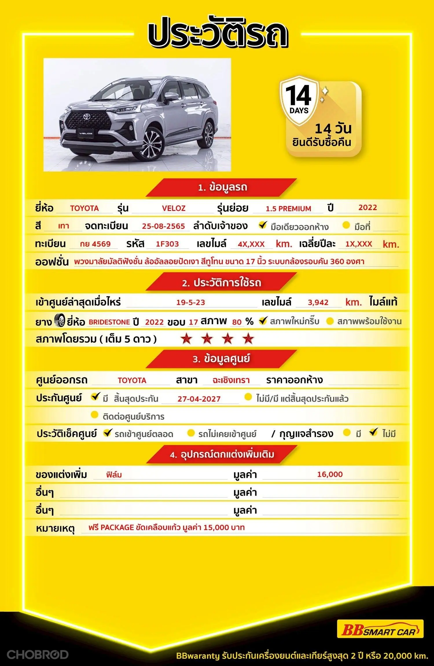 มีการรับประกันจากดีลเลอร์ (6 เดือน) มีบริการช่วยเหลือฉุกเฉินบนท้องถนน 24 ชม. จากดีลเลอร์