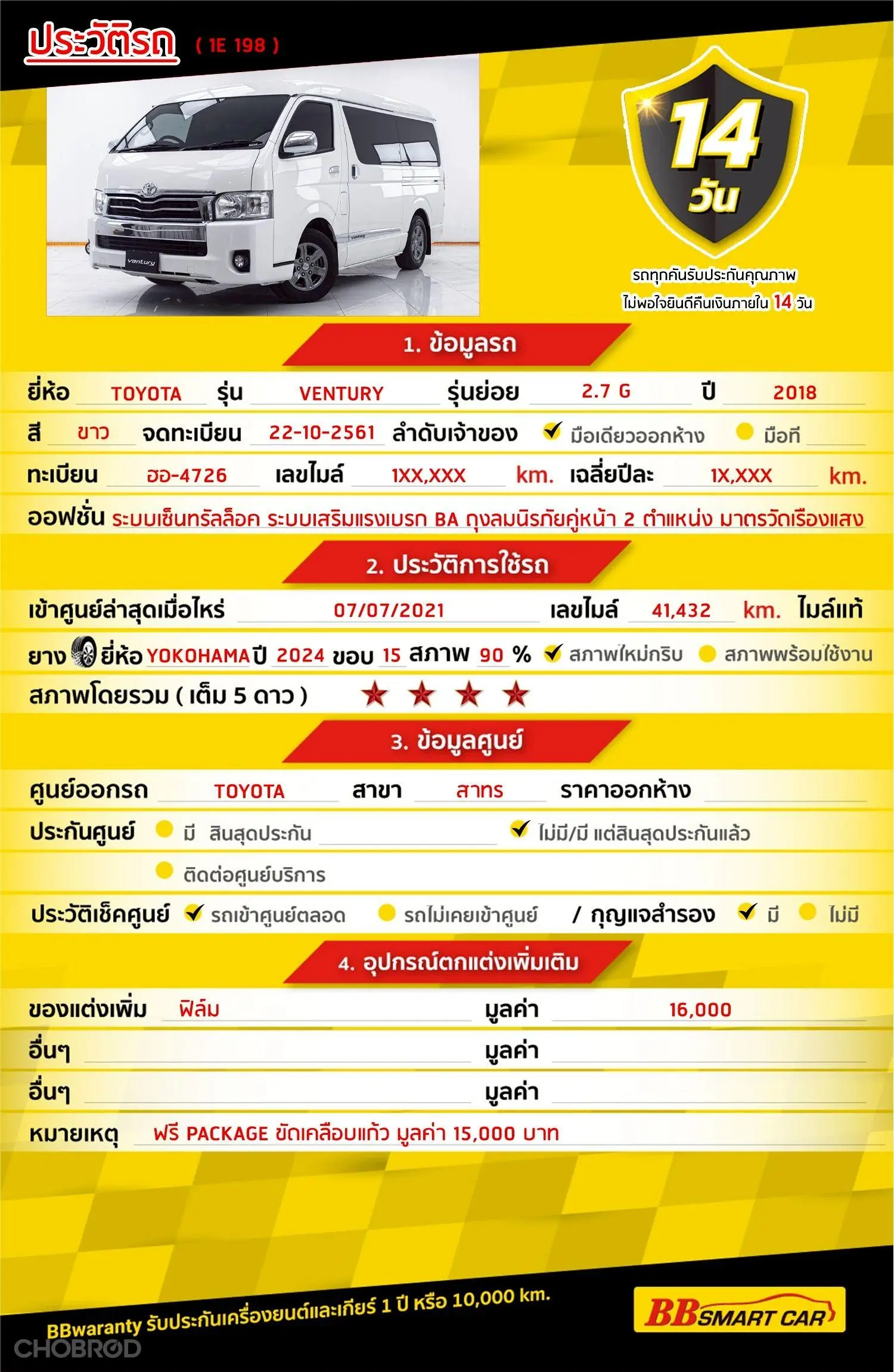 TOYOTA VENTURY 2.7 G AT 2018 ออกรถ 0 บาท จัดได้ 599,000 Line:***********แสดงข้อมูล 🔥จอง 199 บาท ส่งบัตรประชาชน รู้ผลพิจารณาภายใน 30 นาที ไม่ผ่านคืนเงินจองทุกกรณี 🔥ซื้อรถกับ BB พร้อมให้คำปรึกษา แก้ทุกปัญหา ให้ทุกเรื่อง บริการ call center 24 ชม. 🔥BB Care Plus รับประกันหลังการขาย สูงสุด 2 ปี หรือ 20,000 km.. 🔥มีรถให้เลือกมากกว่า 1,800 คัน สาขา 1 สี่แยกมไหสวรรย์ ใกล้เดอะมอลล์ท่าพระ รหัสรถ 1E198 ราคา 579,000 บาท ผ่อนเพียง 10,281 บาท Brand. : TOYOTA Year. : 2018 Model. : VENTURY Grade. : 2.7 G Engine. : 2700 CC Type. : เบนซิน+CNG Gearbox : AT Color. : ขาว Mileage. : 111,XXX KM. (ซื้อสด ราคานี้ยังไม่รวมค่าดำเนินการ 10,000 บ.) 🚩 Price. 579,000 บาท ยอดจัด : 589,000 บาท เงินดาวน์ : 0 บาท ประกันภัย : ฟรีประกันภัย 1 ปี ค่าดำเนินการ : 10,000 บาท รวมออกรถ : 0 บาท ผ่อน 36 งวด = 18,866 บาท ผ่อน 48 งวด = 14,490 บาท ผ่อน 60 งวด = 12,547 บาท ผ่อน 72 งวด = 11,269 บาท ผ่อน 84 งวด = 10,281 บาท เงื่อนไขเป็นไปตามที่ไฟแนนซ์กำหนด โปรโมชั่นพิเศษ สำหรับลูกค้าเครดิตดีลือกรับเรทดอกเบี้ยพิเศษ 📍36 งวด = 2.59 % 📍48 งวด = 2.89 % 📍60 งวด = 3.29 % 📍72 งวด = 4.49 % 🔥 เงื่อนไข โปรโมชั่น ดอกเบี้ยเริ่มต้น 2.59% ตลอดอายุสัญญา - ยอดจัดไฟแนนซ์ 300,000-600,000 บาท - ผ่อนสูงสุด 72 เดือน - เป็นลูกค้าประวัติดี - ค่าดำเนินการแคมเปญ 20,000 บาท (รวมในยอดจัดได้) 🎗Car Hightlight รถสวยๆ วันนี้ขอแนะนำ TOYOTA VENTURY 2.7 G AT 2018 จุดเด่นออฟชั่น 1 : ไฟหน้ามัลติรีเฟลกเตอร์ แบบฮาโลเจน 2 :มาตรวัดเรืองแสง Optitron หน้าจอแสดงข้อมูลการขับขี่ MID ประตูสไลด์ ซ้าย-ขวา 3 : ระบบเซ็นทรัลล็อค เครื่องเสียง วิทยุ AM / FM / CD / MP3 ช่องเชื่อมต่อ USB 2 ตำแหน่ง 🎗ภายใน ระบบเบรกป้องกันล้อล็อค ABS ระบบควบคุมการทรงตัว VSC ระบบป้องกันล้อหมุนฟรี TRC ระบบช่วยออกตัวบนทางลาดชัน HAC ระบบเสริมแรงเบรก BA ระบบไฟฉุกเฉินอัตโนมัติ เมื่อเบรกกระทันหัน ESS กระจกหลังส่องทาง ระบบไล่ฝ้ากระจกบังลมหลัง ถุงลมนิรภัยคู่หน้า 2 ตำแหน่ง 🎗ภายนอก กันชนหน้าโครเมียม ล้อแมกซ์ขอบ 15 นิ้ว ที่ปัดหมอกด้านหลัง ไฟหน้า-ท้ายส่องสว่างแบบ LED 🎗ความคุ้มค่า สำหรับคันนี้หากเปรียบเทียบราคากับคุณภาพ คันนี้ถือว่าคุ้มค่ามากค่ะ ผ่อนสบายๆก็มีรถขับได้ รถดีมีคุณภาพแบบนี้รีบตัดสินใจซื้อได้เลราคานี้มาไวไปไวนะคะ ⭐️การรับประกันหลังการขาย BB Care Plus สูงสุด 2 ปี หรือ 20,000 km. ด้วยช่างที่ผ่านการอบรมจากศูนย์ชั้นนำของประเทศ 🎉Special offer เฉพาะ บีบีสมาร์ทคาร์ ที่นี่ที่เดียว ⭐ดอกเบี้ยเริ่มต้น 2.59% มีไฟแนนซ์รองรับหลายที่ค่ะ ⭐ฟรี!! แพคเก็จ ขัดเคลือบแก้ว มูลค่า 15,000 บาท ทุกคัน ⭐อนุมัติไว 30 นาที นำเอกสารมาให้ครบรับรถกลับบ้านทันทีค่ะ ⭐BB Care Plus รับประกันหลังการขาย สูงสุด 2 ปี หรือ 20,000 km. ⭐มี 6 สาขา ในกรุงเทพและปริมณฑลใกล้บ้านท่าน ⭐รถทุกคันผ่านตรวจสอบ Inspection เรียบร้อยแล้วค่ะ ผ่าน 5 ดาวทุกคันค่ะ ⭐เซลล์ทุกท่านเป็นมืออาชีพพร้อมให้บริการทุกท่านแน