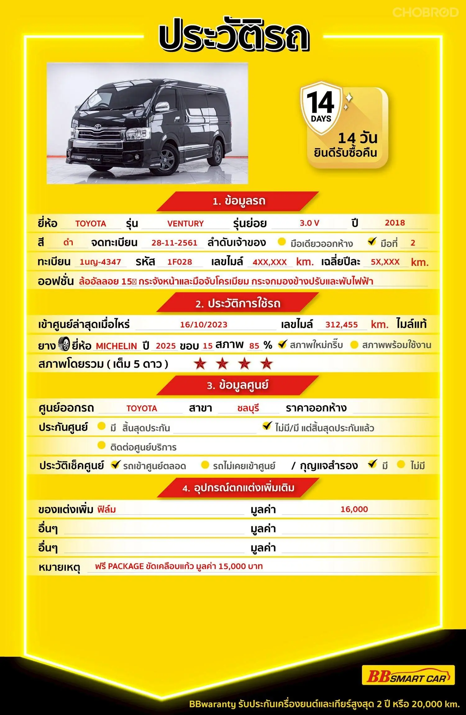 TOYOTA VENTURY 3.0 V AT 2018 ออกรถ 0 บาท จัดได้ 619,000 บ. Line:@BBCAR1 🔥มีรถให้เลือกมากกว่า 1,800 คัน 🔥รถทุกคันผ่านตรวจสอบ Inspection เรียบร้อยแล้วค่ะ ผ่าน 5 ดาวทุกคันค่ะ 🔥ซื้อรถกับ BB พร้อมให้คำปรึกษา แก้ทุกปัญหา ให้ทุกเรื่อง บริการ call center 24 ชม. 🔥BB Care Plus รับประกันหลังการขาย สูงสุด 2 ปี หรือ 20,000 km. 🔥ฟรี!! แพคเก็จ ขัดเคลือบแก้ว มูลค่า 15,000 บาท ทุกคัน 🔥มี 6 สาขา ในกรุงเทพและปริมณฑลใกล้บ้านท่าน สาขา 1 สี่แยกมไหสวรรย์ ใกล้เดอะมอลล์ท่าพระ รหัสรถ 1F028 ราคา 599,000 บาท ผ่อนเพียง 10,630 บาท Brand. : TOYOTA Year. : 2018 Model. : VENTURY Grade. : 3.0 V Engine. : 3000 CC Type. : ดีเซล Gearbox : AT Color. : ดำ Mileage. : 411,XXX KM. (ซื้อสด ราคานี้ยังไม่รวมค่าดำเนินการ 10,000 บ.) 🚩 Price. 599,000 บาท ยอดจัด : 609,000 บาท เงินดาวน์ : 0 บาท ประกันภัย : ค่าดำเนินการ : 10,000 บาท รวมออกรถ : 0 บาท ผ่อน 36 งวด = 20,104 บาท ผ่อน 48 งวด = 15,579 บาท ผ่อน 60 งวด = 12,973 บาท ผ่อน 72 งวด = 11,651 บาท ผ่อน 84 งวด = 10,630 บาท เงื่อนไขเป็นไปตามที่ไฟแนนซ์กำหนด โปรโมชั่นพิเศษ สำหรับลูกค้าเครดิตดีลือกรับเรทดอกเบี้ยพิเศษ 📍36 งวด = 2.59 % 📍48 งวด = 2.89 % 📍60 งวด = 3.29 % 📍72 งวด = 4.49 % 🔥 เงื่อนไข โปรโมชั่น ดอกเบี้ยเริ่มต้น 2.59% ตลอดอายุสัญญา - ยอดจัดไฟแนนซ์ 300,000-600,000 บาท - ผ่อนสูงสุด 72 เดือน - เป็นลูกค้าประวัติดี - ค่าดำเนินการแคมเปญ 20,000 บาท (รวมในยอดจัดได้) 🎗Car Hightlight รถสวยๆ วันนี้ขอแนะนำ TOYOTA VENTURY 3.0 V AT 2018 จุดเด่นออฟชั่น 1 : ประตูไฟฟ้า 2 ฝั่ง 2 : PUSHSTART 3 : ล้ออัลลอย 15″ (มาตรฐาน) 🎗ภายใน AIRBAG ABS * เบาะนั่ง 4 แถว 11 ที่นั่ง แถวหน้า: ปรับเลื่อนและเอนด้วยมือ แถวที่ 2: “Captain Seat” ปรับเอน หมุนและเลื่อน แถวอื่นปรับได้และพับแยก 50:50 🎗ภายนอก * กระจังหน้าและมือจับโครเมียม * ระจกมองข้าง ปรับและพับด้วยไฟฟ้า พร้อมไฟเลี้ยวในตัว * ระบบปัดน้ำฝนด้านหน้า – ด้านหลัง * ไฟท้าย LED * ไฟ Daytime Running Lights (LED) * ล้อ MICHELIN ปี 25 ขอบ 15 🎗ความคุ้มค่า สำหรับคันนี้หากเปรียบเทียบราคากับคุณภาพ คันนี้ถือว่าคุ้มค่ามากค่ะ ผ่อนสบายๆก็มีรถขับได้ รถดีมีคุณภาพแบบนี้รีบตัดสินใจซื้อได้เลราคานี้มาไวไปไวนะคะ