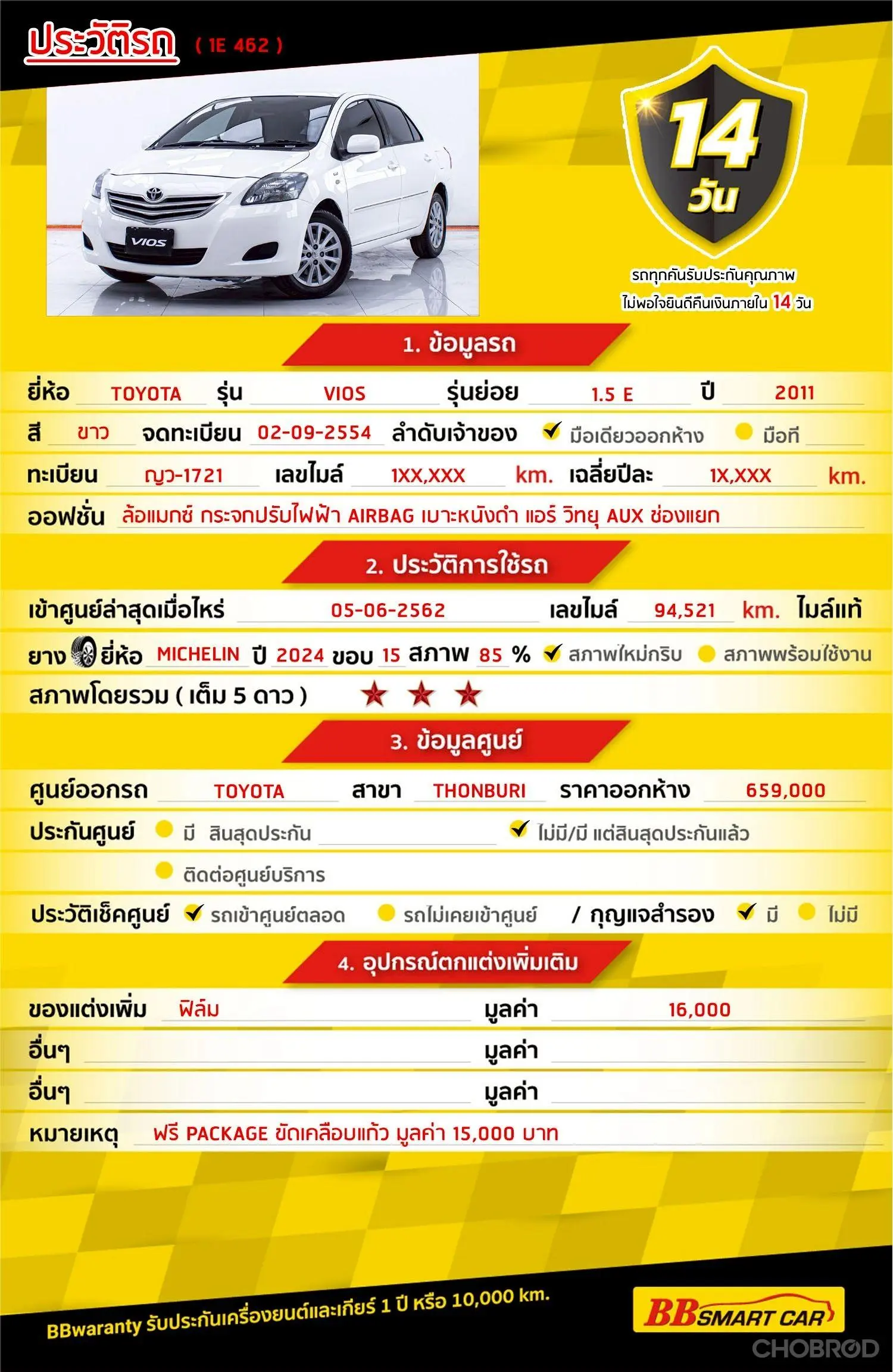 TOYOTA VIOS 1.5 E AT 2011 ออกรถ 0 บาท จัดได้ 159,000 บ. Line:@**********แสดงข้อมูล 🔥จอง 199 บาท ส่งบัตรประชาชน รู้ผลพิจารณาภายใน 30 นาที ไม่ผ่านคืนเงินจองทุกกรณี 🔥ซื้อรถกับ BB พร้อมให้คำปรึกษา แก้ทุกปัญหา ให้ทุกเรื่อง บริการ call center 24 ชม. 🔥BB Care Plus รับประกันหลังการขาย สูงสุด 2 ปี หรือ 20,000 km.. 🔥มีรถให้เลือกมากกว่า 1,800 คัน สาขา 1 สี่แยกมไหสวรรย์ ใกล้เดอะมอลล์ท่าพระ รหัสรถ 1E462 ราคา 139,000 บาท ผ่อนเพียง 2,894 บาท Brand. : TOYOTA Year. : 2011 Model. : VIOS Grade. : 1.5 E Engine. : 1500 CC Type. : เบนซิน Gearbox : AT Color. : ขาว Mileage. : 160,XXX KM. (ซื้อสด ราคานี้ยังไม่รวมค่าดำเนินการ 10,000 บ.) 🚩 Price. 139,000 บาท ยอดจัด : 149,000 บาท เงินดาวน์ : 0 บาท ประกันภัย : ฟรีประกันภัย 1 ปี ค่าดำเนินการ : 10,000 บาท รวมออกรถ : 0 บาท ผ่อน 36 งวด = 5,126 บาท ผ่อน 48 งวด = 4,019 บาท ผ่อน 60 งวด = 3,454 บาท ผ่อน 72 งวด = 3,078 บาท ผ่อน 84 งวด = 2,894 บาท เงื่อนไขเป็นไปตามที่ไฟแนนซ์กำหนด โปรโมชั่นพิเศษ สำหรับลูกค้าเครดิตดีลือกรับเรทดอกเบี้ยพิเศษ 📍36 งวด = 1.29 % 📍48 งวด = 1.99 % 📍60 งวด = 2.39 % 📍72 งวด = 3.59 % 🔥 เงื่อนไข โปรโมชั่น ดอกเบี้ยเริ่มต้น 1.29% ตลอดอายุสัญญา - ยอดจัดไฟแนนซ์ 300,000-600,000 บาท - ผ่อนสูงสุด 72 เดือน - เป็นลูกค้าประวัติดี พนักงานประจำเงินเดือน 20,000 ขึ้นไป - ค่าดำเนินการแคมเปญ 20,000 บาท (รวมในยอดจัดได้) 🎗Car Hightlight รถสวยๆ วันนี้ขอแนะนำ TOYOTA VIOS 1.5 E AT 2011 จุดเด่นออฟชั่น 1 : ล้อแมกซ์ กระจกปรับไฟฟ้า 2 : เบาะหนังดำ 3 : แอร์ วิทยุ AUX ช่องแยก 🎗ภายใน AIRBAG 🎗ภายนอก ล้อแมกซ์ 15 นิ้ว ฟหน้าแบบ LED เปิด-ปิดอัตโนมัติ กระจกมองข้างปรับไฟฟ้า พร้อมไฟเลี้ยว ไฟตัดหมอกหลัง ไฟท้ายแบบ LED 🎗ความคุ้มค่า สำหรับคันนี้หากเปรียบเทียบราคากับคุณภาพ คันนี้ถือว่าคุ้มค่ามากค่ะ ผ่อนสบายๆก็มีรถขับได้ รถดีมีคุณภาพแบบนี้รีบตัดสินใจซื้อได้เลราคานี้มาไวไปไวนะคะ ⭐️การรับประกันหลังการขาย BB Care Plus สูงสุด 2 ปี หรือ 20,000 km. ด้วยช่างที่ผ่านการอบรมจากศูนย์ชั้นนำของประเทศ 🎉Special offer เฉพาะ บีบีสมาร์ทคาร์ ที่นี่ที่เดียว ⭐ดอกเบี้ยเริ่มต้น 1.29% มีไฟแนนซ์รองรับหลายที่ค่ะ ⭐ฟรี!! แพคเก็จ ขัดเคลือบแก้ว มูลค่า 15,000 บาท ทุกคัน ⭐อนุมัติไว 30 นาที นำเอกสารมาให้ครบรับรถกลับบ้านทันทีค่ะ ⭐BB Care Plus รับประกันหลังการขาย สูงสุด 2 ปี หรือ 20,000 km. ⭐มี 6 สาขา ในกรุงเทพและปริมณฑลใกล้บ้านท่าน ⭐รถทุกคันผ่านตรวจสอบ Inspection เรียบร้อยแล้วค่ะ ผ่าน 5 ดาวทุกคันค่ะ ⭐เซลล์ทุกท่านเป็นมืออาชีพพร้อมให้บริการทุกท่านแน่นอนค่ะ